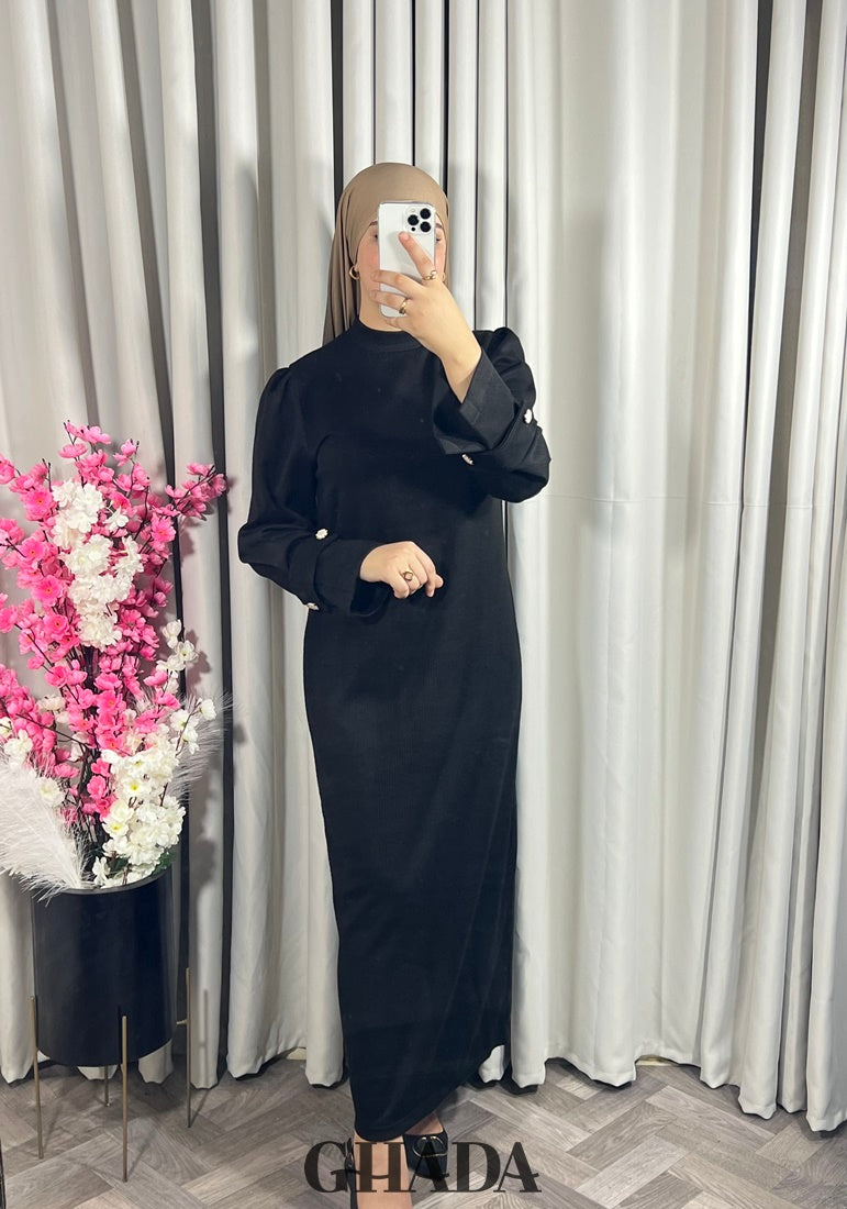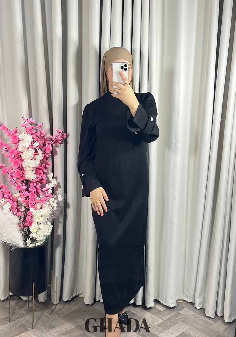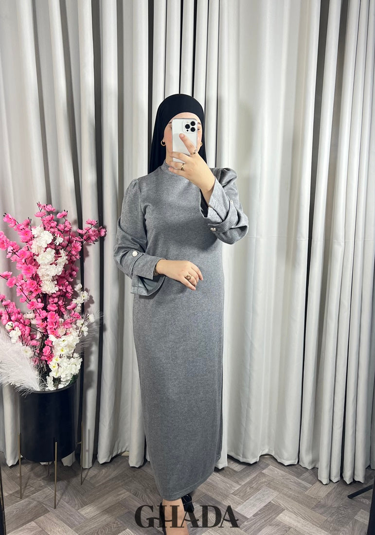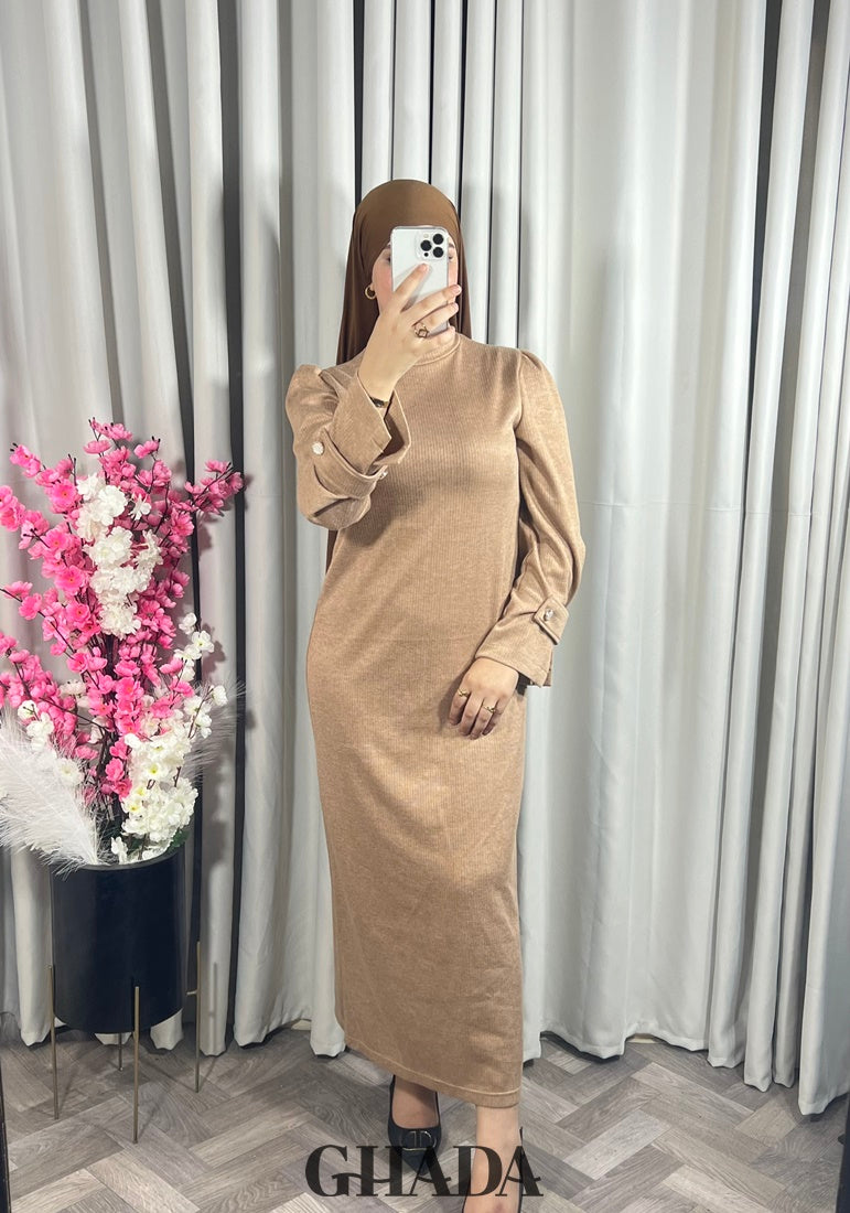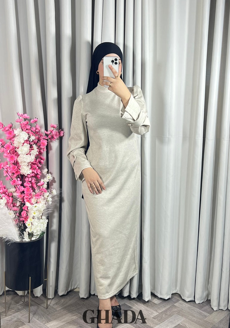Elle est fabriquée d'un tissu maille de haute qualité, avec une coupe droite et fluide. pour garantir un ajustement parfait et un confort durable. Robe longue avec un col rond, les manches sont longues légèrement bouffantes avec de jolies pattes boutonnées.