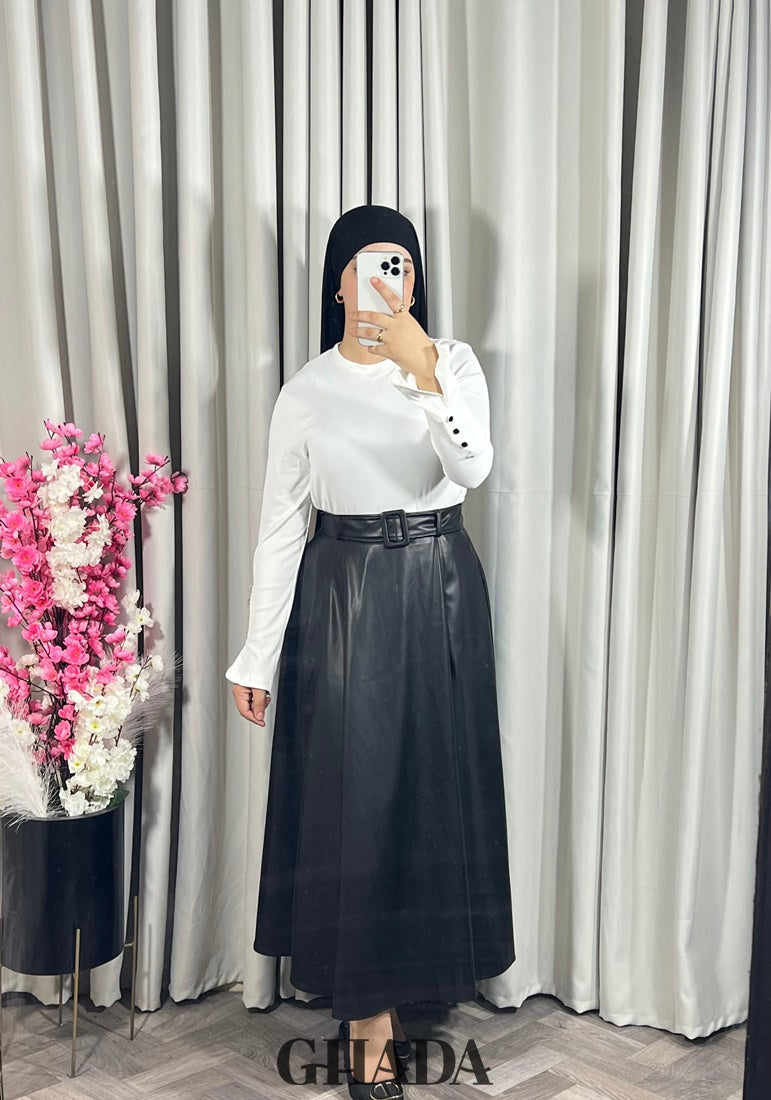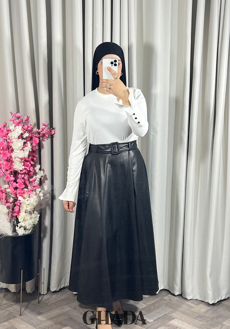Jupe cloche longue en simili cuir, avec fermeture à zip sur le côté et ceinture.