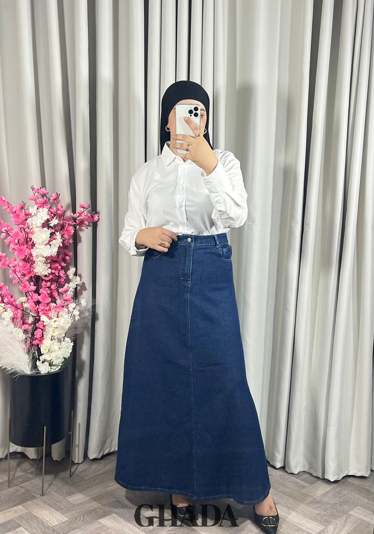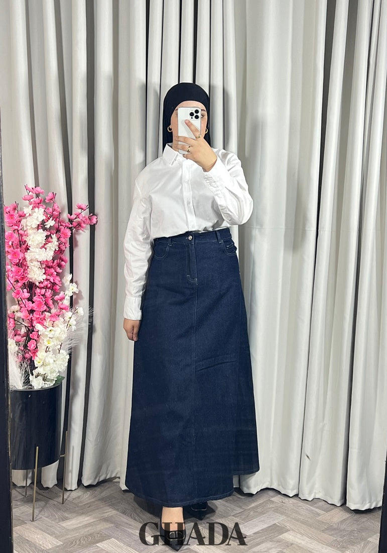 Jupe longue en denim bleu foncé taille haute. avec fermeture à bouton et zipper sur le devant.