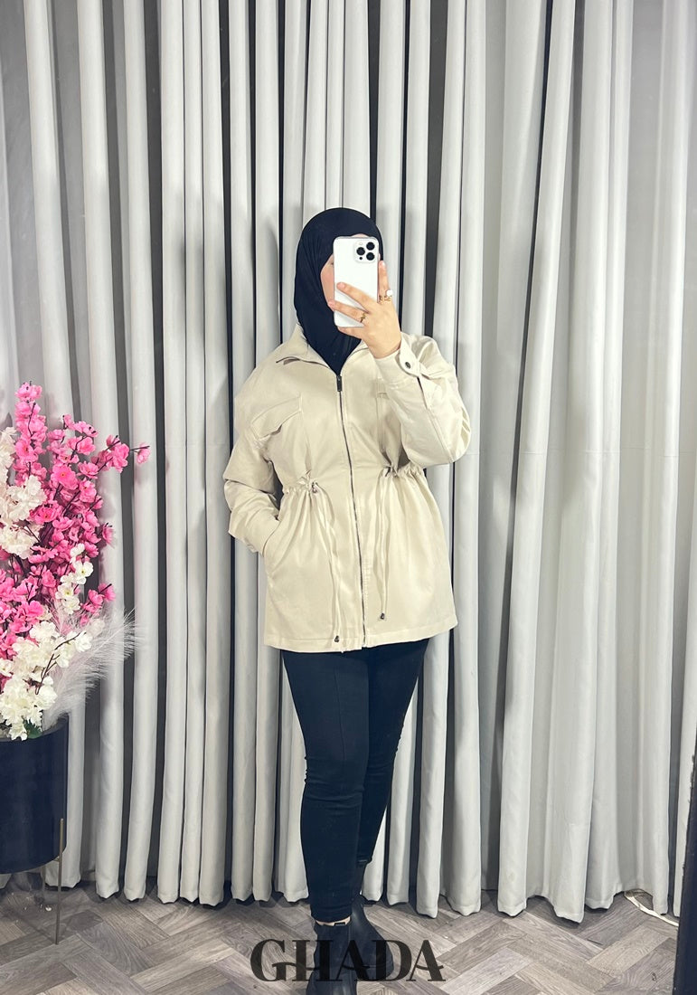 Poches passepoilées sur le devant avec ceinture réglable du même tissu, et une fermeture à boutons.